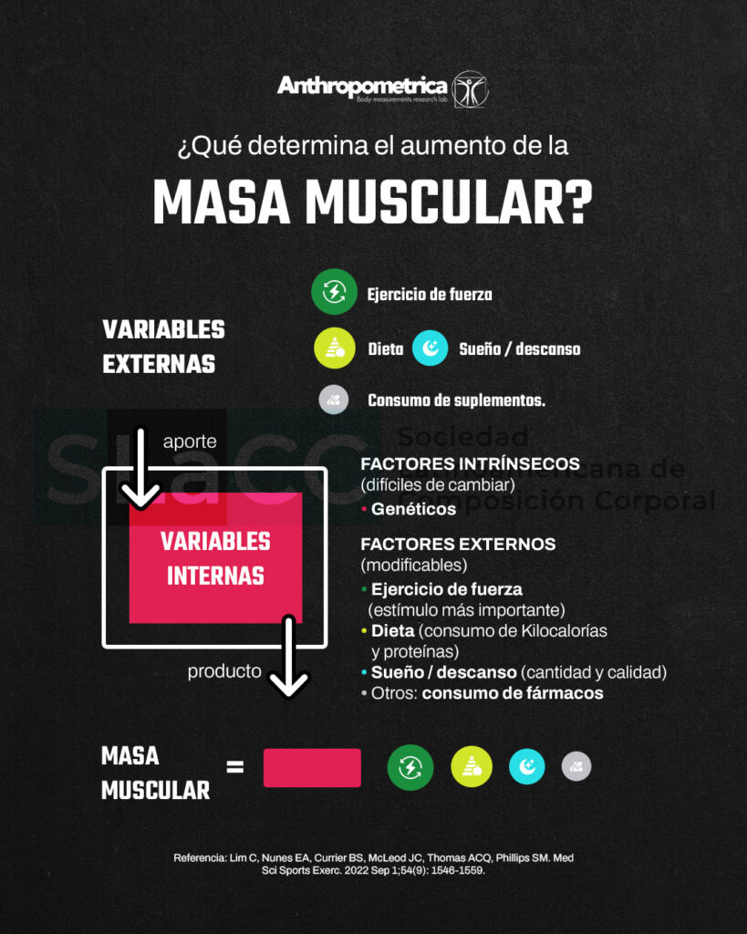 Una baja masa muscular se asocia con una mortalidad incrementada en adultos sanos y con comorbilidades. La regulación de la masa muscular está influenciada por ciertas variables que pueden categorizarse en variables internas y externas del sistema (1).